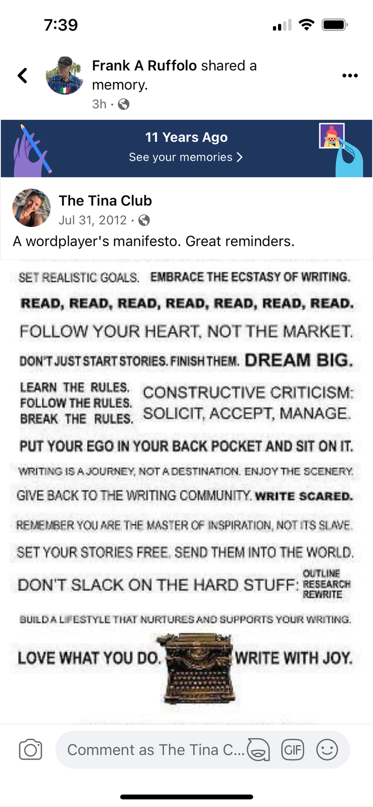 Sneaky reminders of the dusty manuscript started to appear out of nowhere. Like this memory that someone shared the other day on Facebook. Back when Frank originally shared this post, the page was still called Excuse Editor, but because I only changed the name, I received a notification that this writer was once inspired by something I shared, and shared the memory again 11 years later.